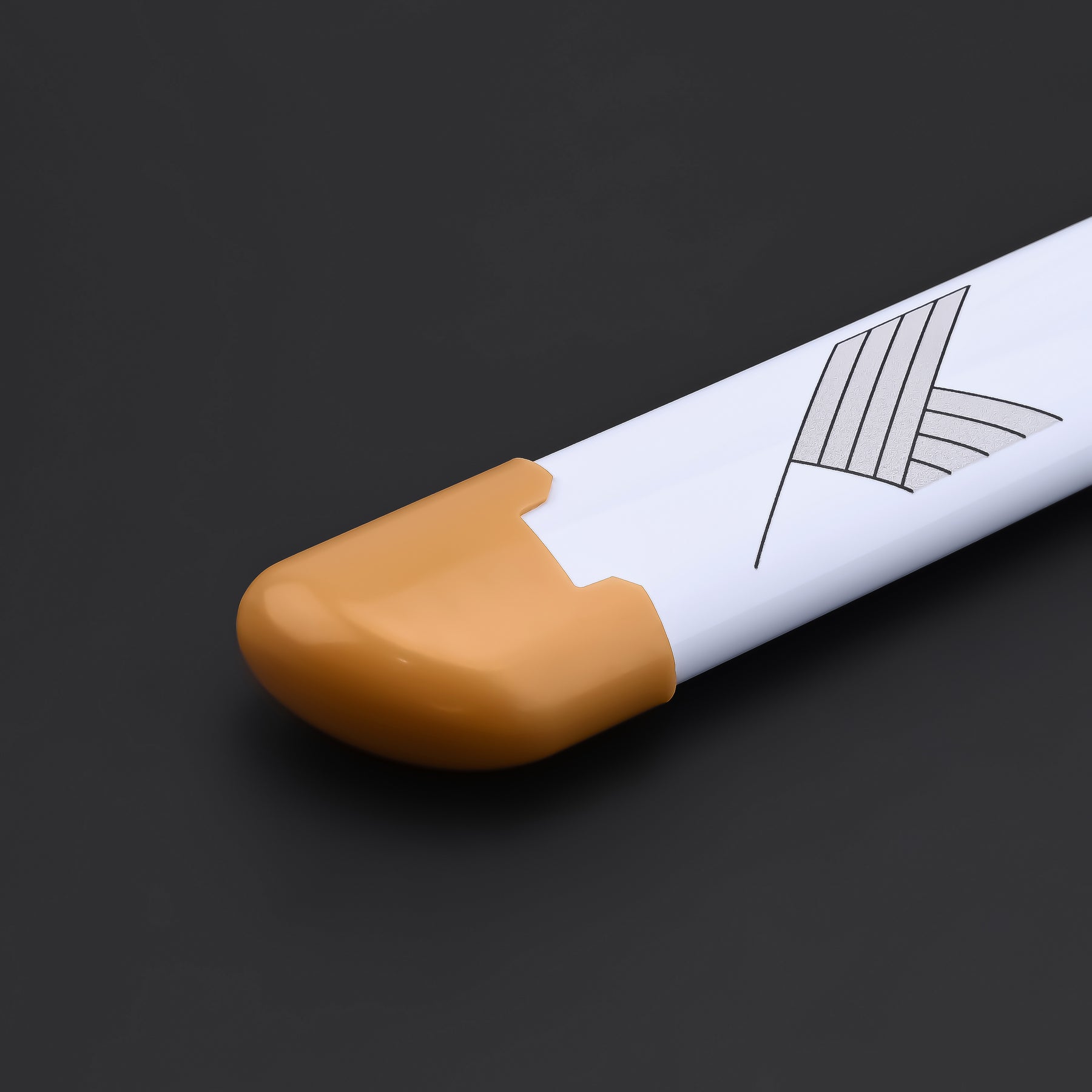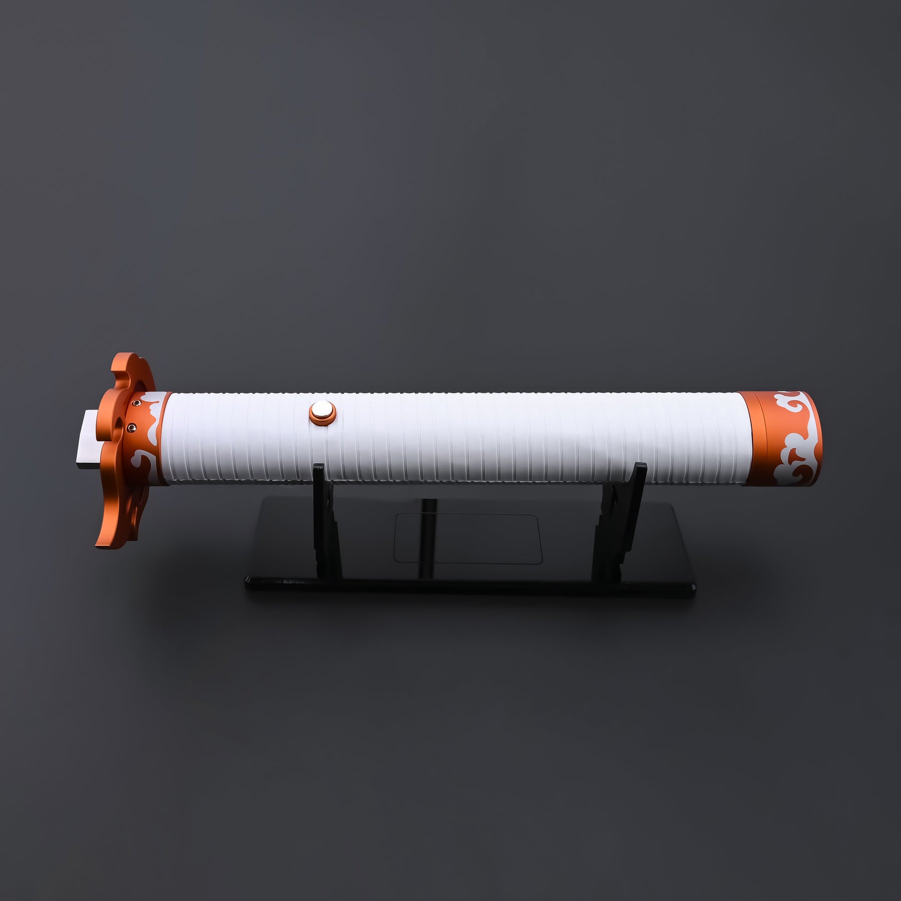 Its white hilt, accented with bold orange metal details, creates a refined yet powerful visual identity. When activated, the blade ignites with vivid, flame-like effects that emphasize motion and intensity.
