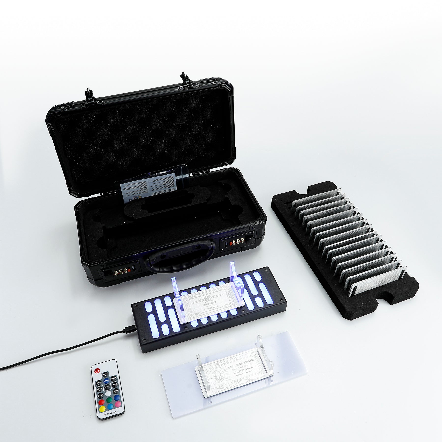 This single-piece illuminated display stand is designed for refined presentation, highlighting one collectible with clarity and balance. Interchangeable nameplates and adapters allow compatibility with different models while maintaining a clean display style.